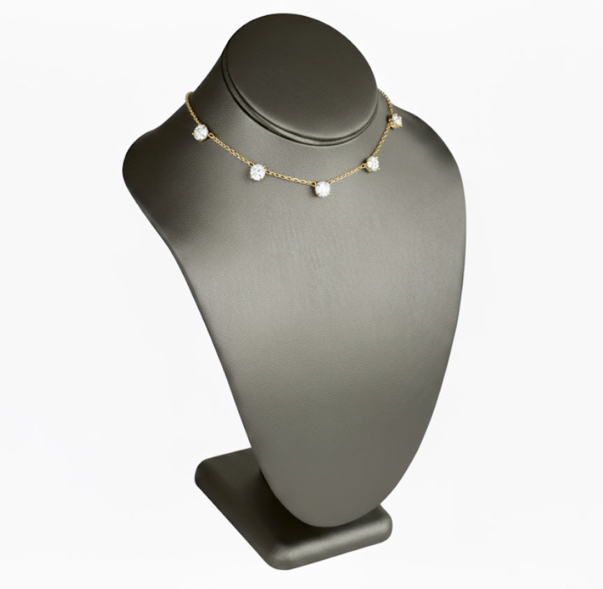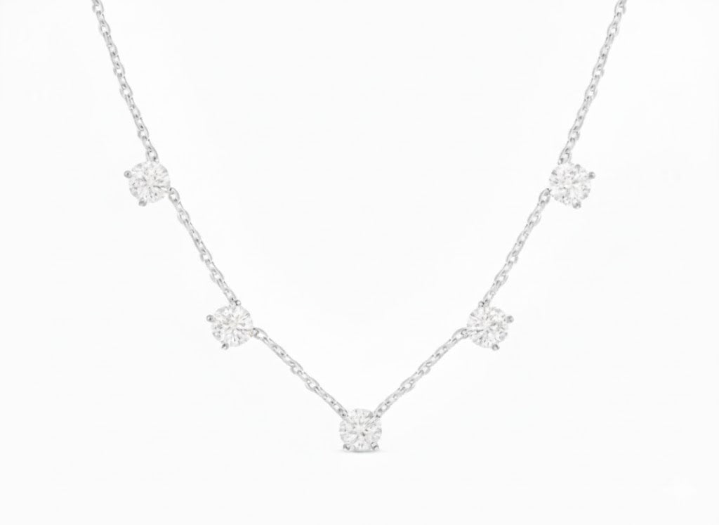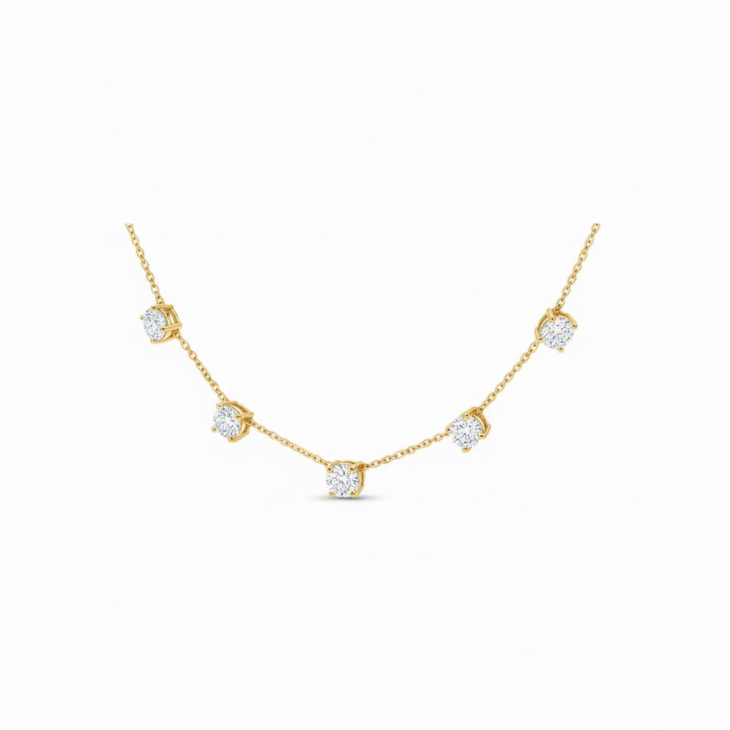 5- half carat round lab-grown diamonds on a classic chain, set in 14k gold. tcw 2.5 carats. 14-16 inches. Colors D-F. VS Clarity.
